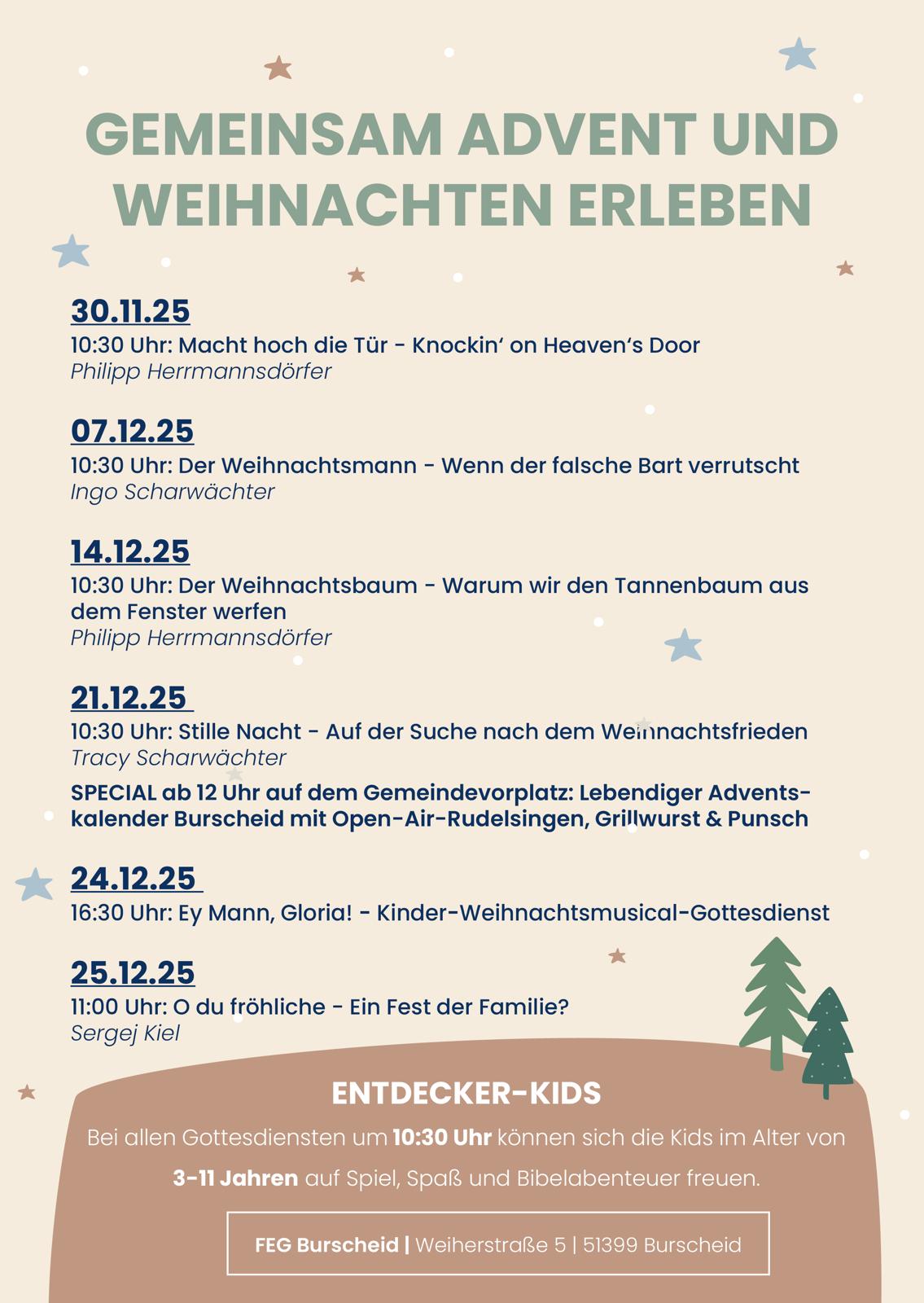 Bald ist es wieder soweit... die schönste Zeit des Jahres für Kleine und Große steht vor der Tür. Auch in unserer Gemeinde feiern wir Advent und Weihnachten - mit besonderen Gottesdiensten und anderen Veranstaltungen.