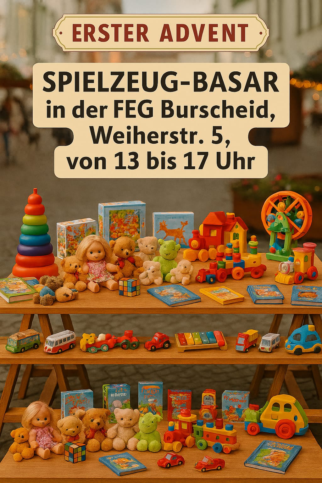 Am 30.11. (1. Advent) findet in unserer Gemeinde ein Spielzeug-Basar statt. Von 13-17 Uhr sind Jung und Alt herzlich willkommen, in gut erhaltenem Spielzeug, Brettspielen, Kartenspielen etc. zu stöbern. Außerdem gibt es Waffeln u.a. Komm einfach vorbei!