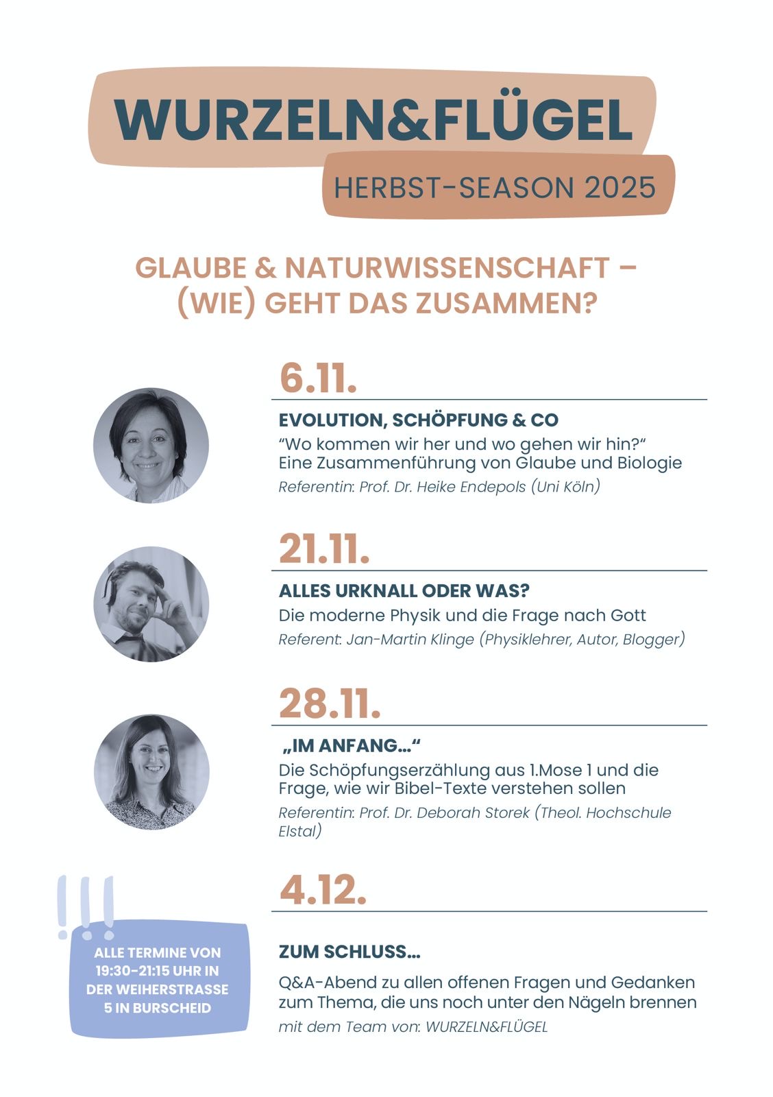 Hinter WURZELN&FLÜGEL steckt in unserer Gemeinde ein kleines Team, zu dem Ulrika Walter, Lukas Schülbe, Henrik Dörmann und Philipp Herrmannsdörfer gehören. Zu den Themen laden wir regelmäßig auch Referent*innen von außen ein.
